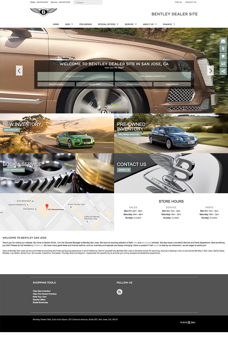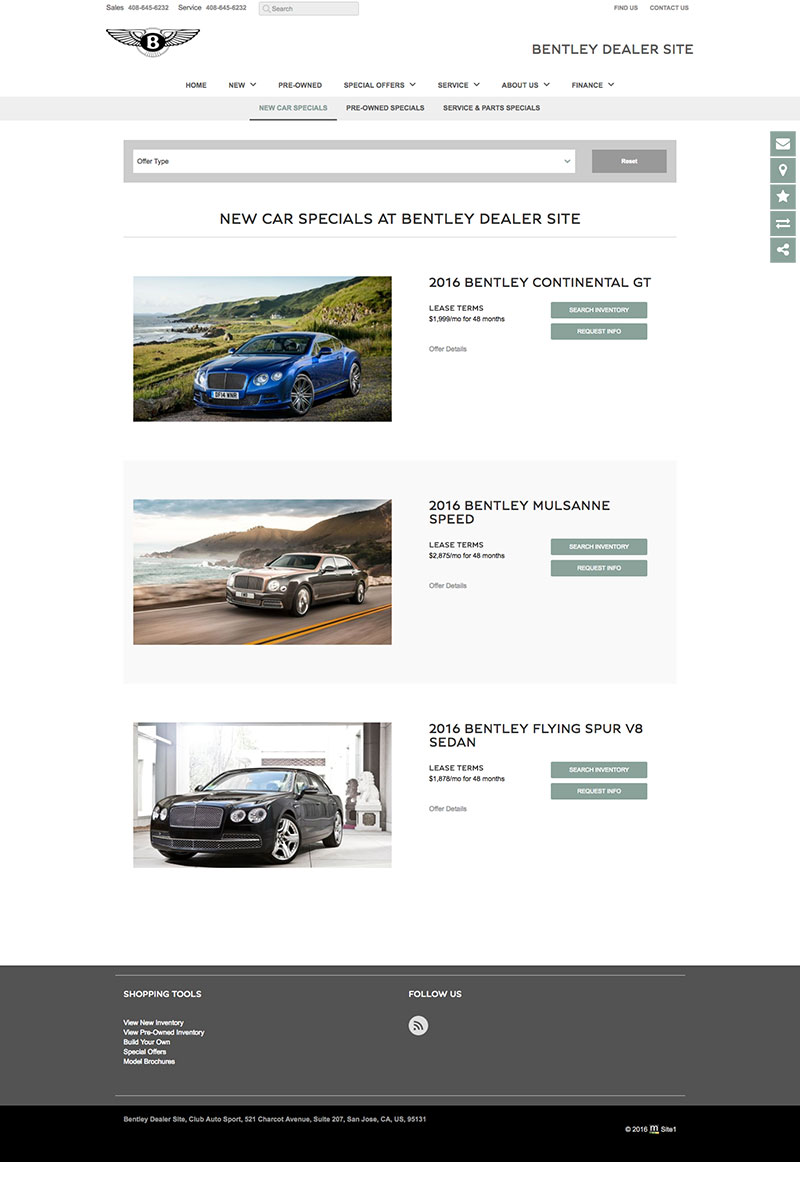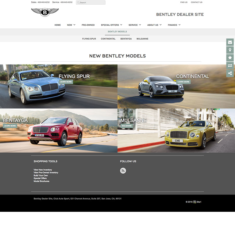 Local brand compliant Bentley dealer websites used to showcase new model information, dealer parts & services, finance applications, lead generation forms and a live automated inventory feed for all vehicles in stock.