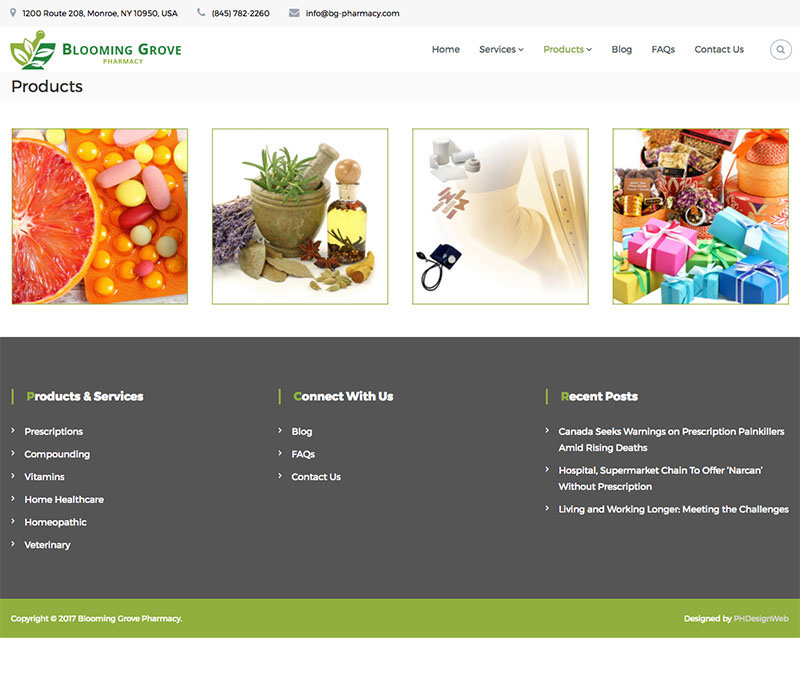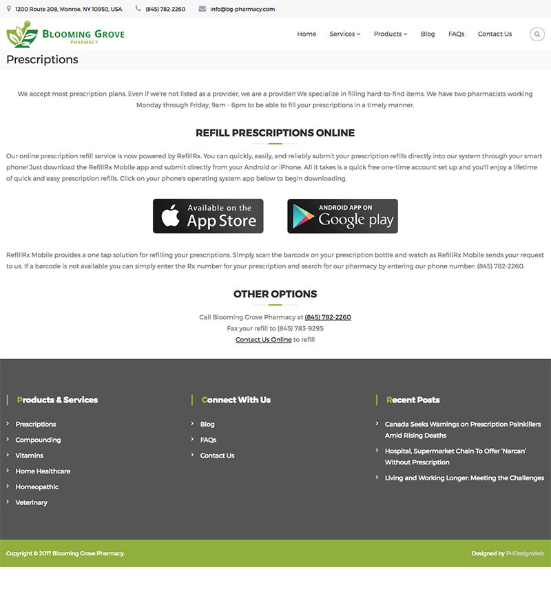 Pharmacy's informational website used for showcasing prescription refill methods, services, products, location and contact information.
