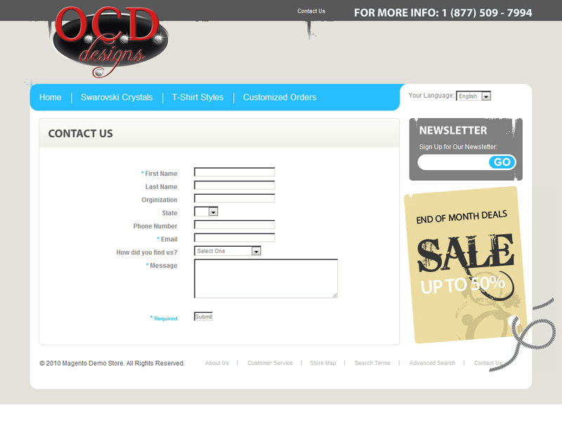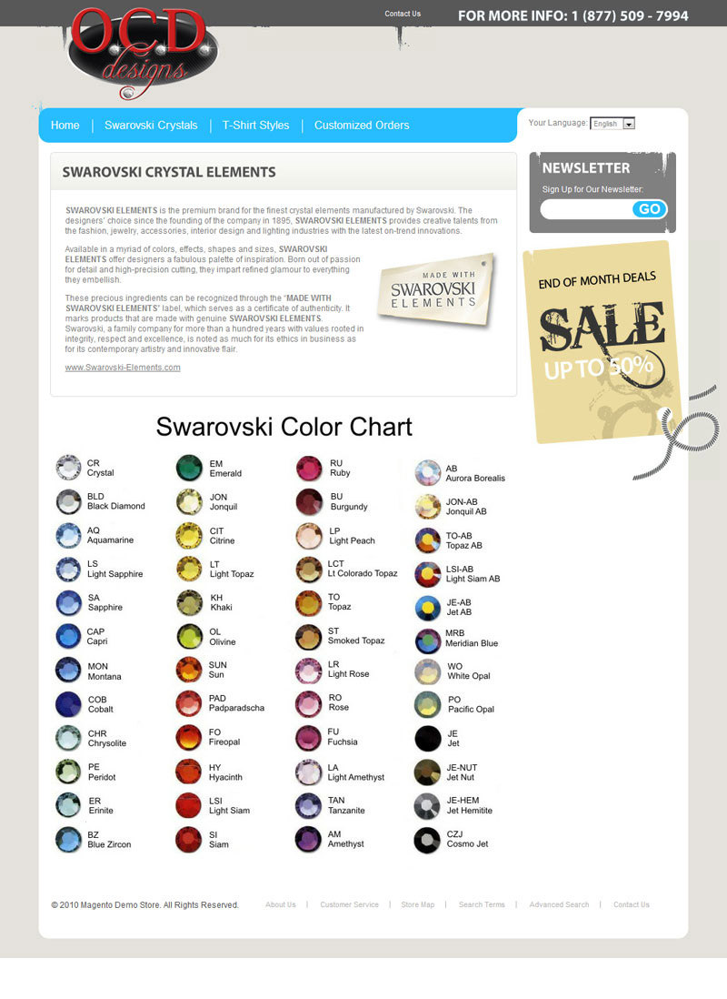 Customized Magento theme website used to display available Swarovsky Crystal t-shirts and for receiving custom orders.