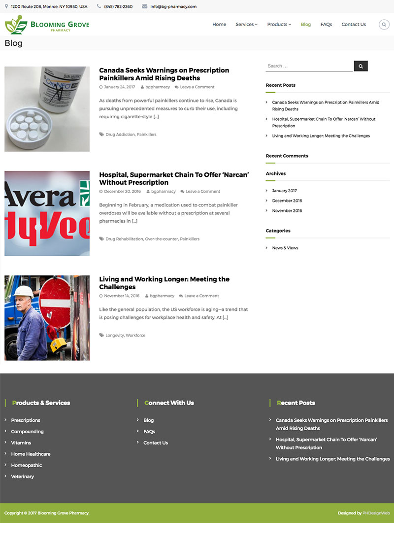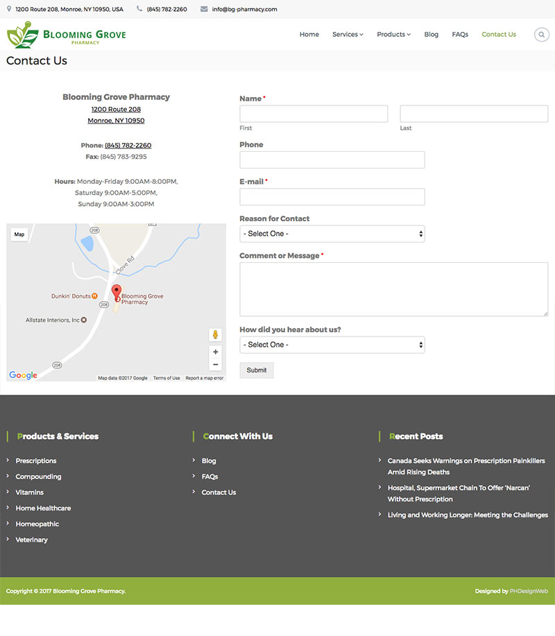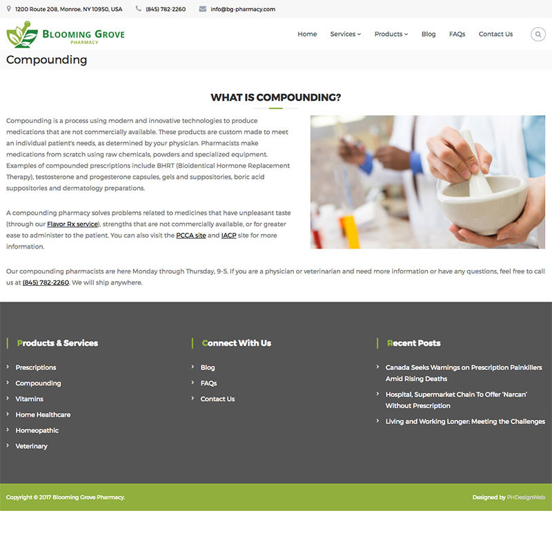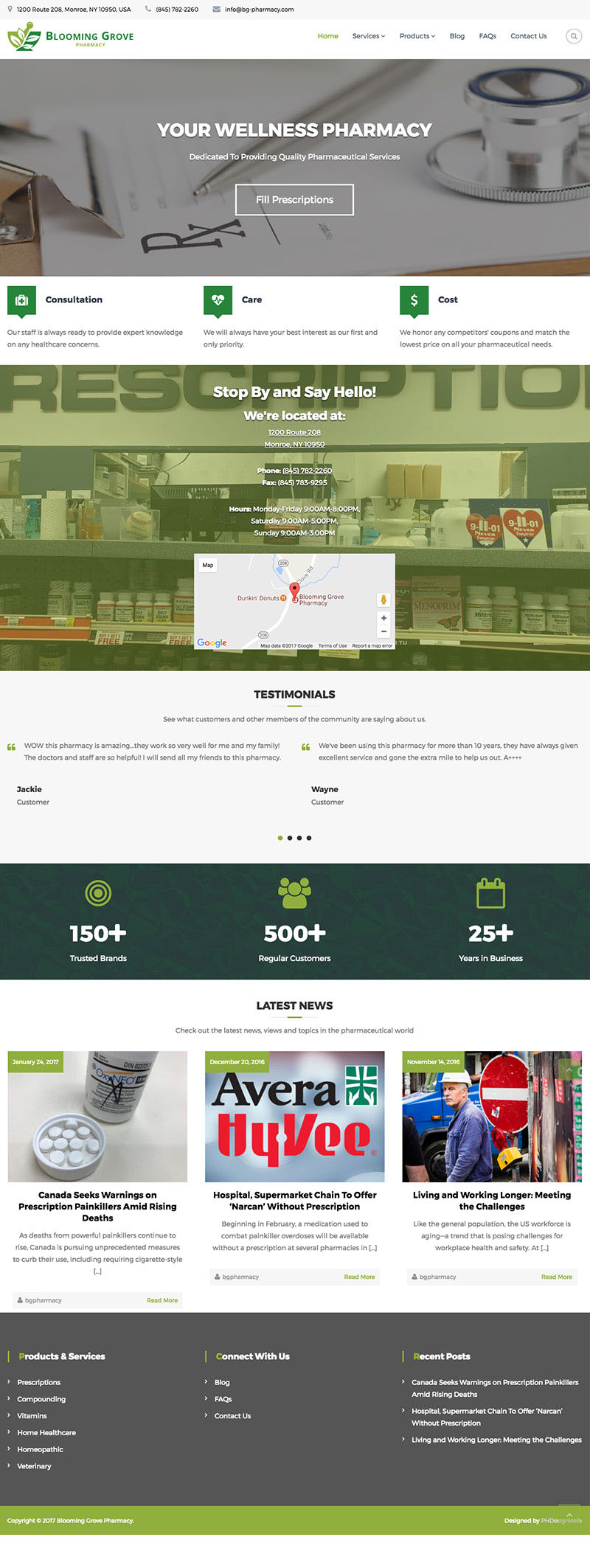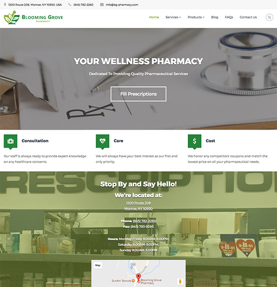 Pharmacy's informational website used for showcasing prescription refill methods, services, products, location and contact information.