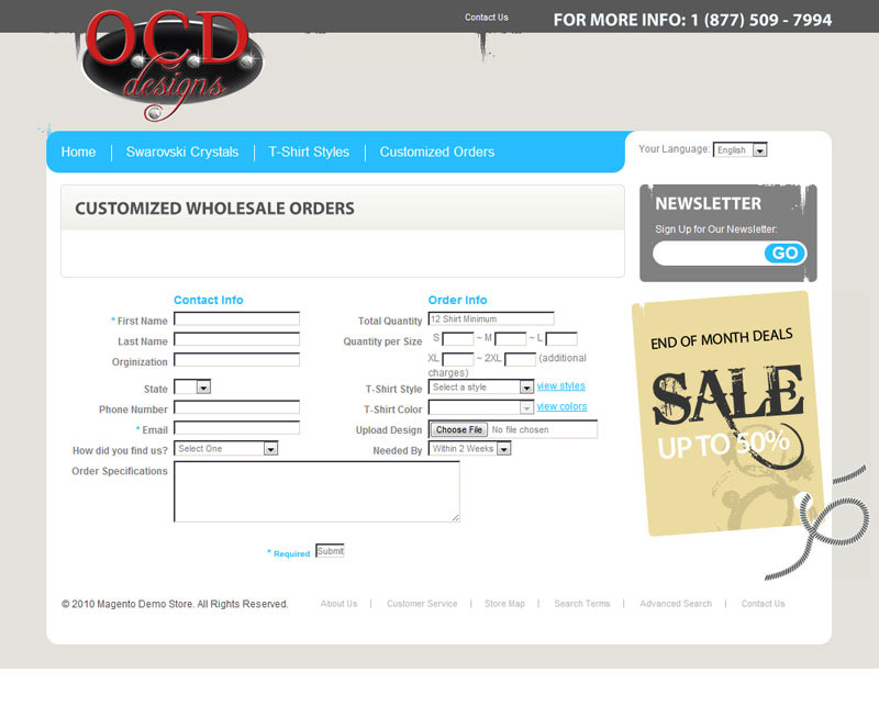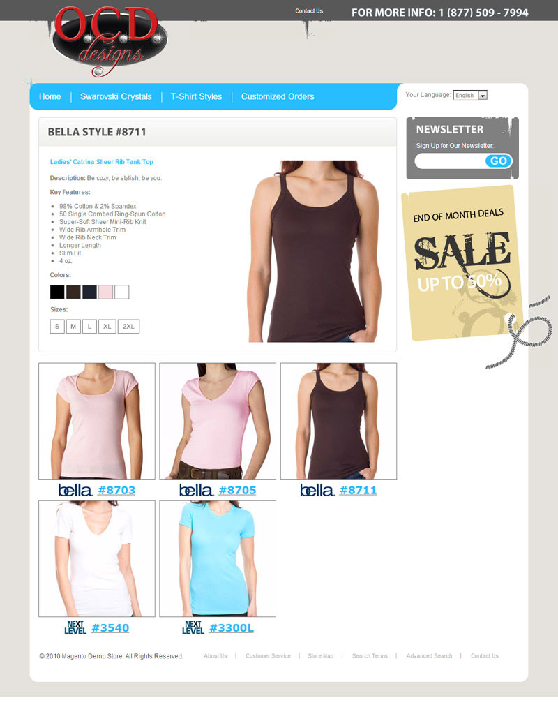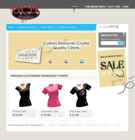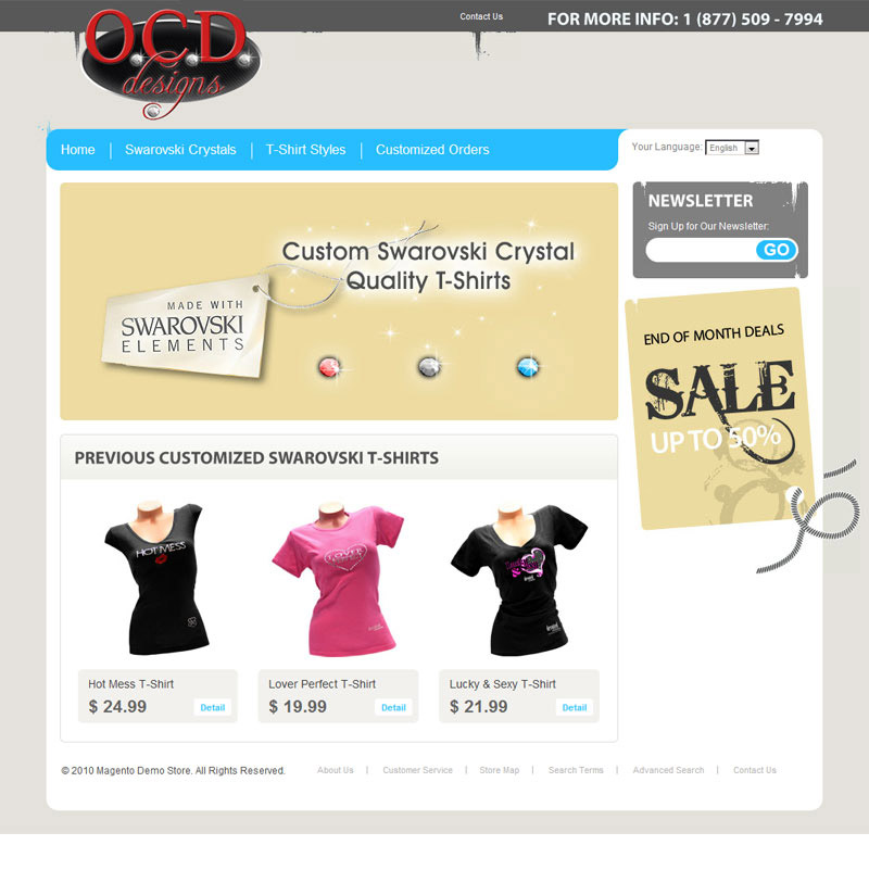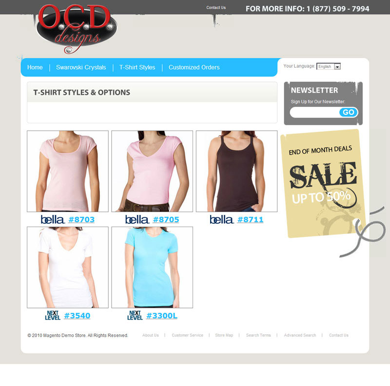 Customized Magento theme website used to display available Swarovsky Crystal t-shirts and for receiving custom orders.